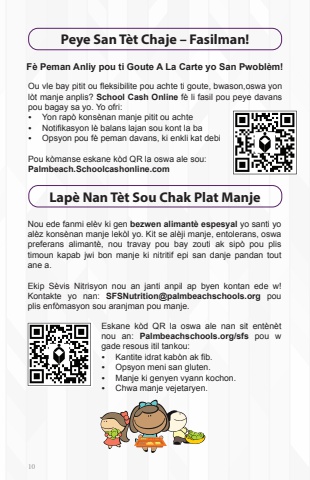 10 F%u00e8 Peman Anliy pou ti Goute A La Carte yo San Pwobl%u00e8m!Ou vle bay pitit ou fleksibilite pou achte ti goute, bwason,oswa yonl%u00f2t manje anplis? School Cash Online f%u00e8 li fasil pou peye davans pou bagay sa yo. Yo ofri:%u2022 Yon rap%u00f2 kons%u00e8nan manje pitit ou achte%u2022 Notifikasyon l%u00e8 balans lajan sou kont la ba%u2022 Opsyon pou f%u00e8 peman davans, ki enkli kat debi Pou k%u00f2manse eskane k%u00f2d QR la oswa ale sou:Palmbeach.Schoolcashonline.com10 Lap%u00e8 Nan T%u00e8t Sou Chak Plat ManjeNou ede fanmi el%u00e8v ki gen bezwen alimant%u00e8 espesyal yo santi yoal%u00e8z kons%u00e8nan manje lek%u00f2l yo. Kit se al%u00e8ji manje, entolerans, oswapreferans alimant%u00e8, nou travay pou bay zouti ak sip%u00f2 pou plistimoun kapab jwi bon manje ki nitritif epi san danje pandan toutane a.Ekip S%u00e8vis Nitrisyon nou an janti anpil ap byen kontan ede w!Kontakte yo nan: SFSNutrition@palmbeachschools.org pouplis enf%u00f2masyon sou aranjman pou manje. Eskane k%u00f2d QR la oswa ale nan sit ent%u00e8n%u00e8t nou an: Palmbeachschools.org/sfs pou w gade resous itil tankou:%u2022 Kantite idrat kab%u00f2n ak fib.%u2022 Opsyon meni san gluten.%u2022 Manje ki genyen vyann kochon.%u2022 Chwa manje vejetaryen.Peye San T%u00e8t Chaje %u2013 Fasilman!