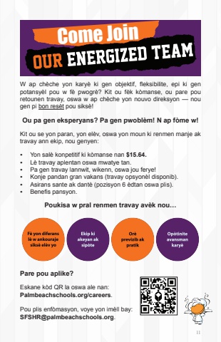 11W ap ch%u00e8che yon kary%u00e8 ki gen objektif, fleksibilite, epi ki genpotansy%u00e8l pou w f%u00e8 pwogr%u00e8? Kit ou f%u00e8k k%u00f2manse, ou pare pouretounen travay, oswa w ap ch%u00e8che yon nouvo direksyon %u2014 nougen pi bon res%u00e8t pou siks%u00e8!Kit ou se yon paran, yon el%u00e8v, oswa yon moun ki renmen manje ak travay ann ekip, nou genyen:%u2022 Yon sal%u00e8 konpetitif ki k%u00f2manse nan $15.64.%u2022 L%u00e8 travay aplentan oswa mwatye tan.%u2022 Pa gen travay lannwit, wikenn, oswa jou ferye!%u2022 Konje pandan gran vakans (travay opsyon%u00e8l disponib).%u2022 Asirans sante ak dant%u00e8 (pozisyon 6 %u00e8dtan oswa plis).%u2022 Benefis pansyon.Come JoinOu pa gen eksperyans? Pa gen pwobl%u00e8m! N ap f%u00f2me w!Eskane k%u00f2d QR la oswa ale nan:Palmbeachschools.org/careers.Pou plis enf%u00f2masyon, voye yon im%u00e8ll bay:SFSHR@palmbeachschools.org.Pare pou aplike?Poukisa w pral renmen travay av%u00e8k nou%u2026