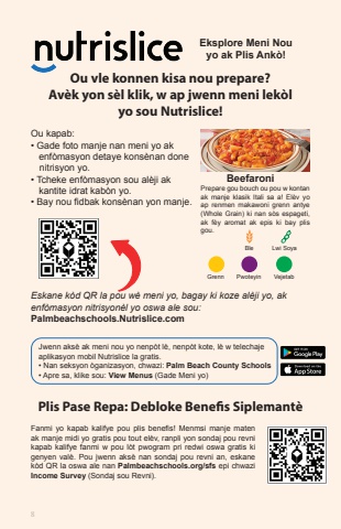 8 Jwenn aks%u00e8 ak meni nou yo nenp%u00f2t l%u00e8, nenp%u00f2t kote, l%u00e8 w telechaje aplikasyon mobil Nutrislice la gratis.%u2022 Nan seksyon %u00f2ganizasyon, chwazi: Palm Beach County Schools%u2022 Apre sa, klike sou: View Menus (Gade Meni yo)8 Eksplore Meni Nouyo ak Plis Ank%u00f2!Ou vle konnen kisa nou prepare?Av%u00e8k yon s%u00e8l klik, w ap jwenn meni lek%u00f2lyo sou Nutrislice!Ou kapab:%u2022 Gade foto manje nan meni yo ak enf%u00f2masyon detaye kons%u00e8nan done nitrisyon yo.%u2022 Tcheke enf%u00f2masyon sou al%u00e8ji ak kantite idrat kab%u00f2n yo.%u0009 %u2022 Bay nou fidbak kons%u00e8nan yon manje.Eskane k%u00f2d QR la pou w%u00e8 meni yo, bagay ki koze al%u00e8ji yo, ak enf%u00f2masyon nitrisyon%u00e8l yo oswa ale sou: Palmbeachschools.Nutrislice.comFanmi yo kapab kalifye pou plis benefis! Menmsi manje matenak manje midi yo gratis pou tout el%u00e8v, ranpli yon sondaj pou revni kapab kalifye fanmi w pou l%u00f2t pwogram pri redwi oswa gratis ki genyen val%u00e8. Pou jwenn aks%u00e8 nan sondaj pou revni an, eskane k%u00f2d QR la oswa ale nan Palmbeachschools.org/sfs epi chwazi Income Survey (Sondaj sou Revni).Plis Pase Repa: Debloke Benefis Siplemant%u00e8BeefaroniPrepare gou bouch ou pou w kontanak manje klasik Itali sa a! El%u00e8v yoap renmen makawoni grenn antye(Whole Grain) ki nan s%u00f2s espageti,ak f%u00e8y aromat ak epis ki bay plisgou.Grenn Pwoteyin VejetabBle Lwi Soya