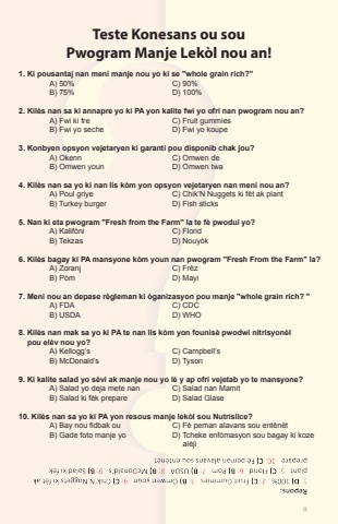 9Teste Konesans ou souPwogram Manje Lek%u00f2l nou an!1. Ki pousantaj nan meni manje nou yo ki se \A) 50% C) 90%B) 75% D) 100%2. Kil%u00e8s nan sa ki annapre yo ki PA yon kalite fwi yo ofri nan pwogram nou an?A) Fwi ki fre C) Fruit gummiesB) Fwi yo seche D) Fwi yo koupe3. Konbyen opsyon vejetaryen ki garanti pou disponib chak jou?A) Okenn C) Omwen deB) Omwen youn D) Omwen twa4. Kil%u00e8s nan sa yo ki nan lis k%u00f2m yon opsyon vejetaryen nan meni nou an?A) Poul griye C) Chik%u2019N Nuggets ki f%u00e8t ak plantB) Turkey burger D) Fish sticks5. Nan ki eta pwogram \A) Kalif%u00f2ni C) FloridB) Tekzas D) Nouy%u00f2k6. Kil%u00e8s bagay ki PA mansyone k%u00f2m youn nan pwogram \A) Zoranj C) Fr%u00e8zB) P%u00f2m D) Mayi7. Meni nou an depase r%u00e8gleman ki %u00f2ganizasyon pou manje \A) FDA C) CDCB) USDA D) WHO8. Kil%u00e8s nan mak sa yo ki PA te nan lis k%u00f2m yon founis%u00e8 pwodwi nitrisyon%u00e8l pou el%u00e8v nou yo?A) Kellogg%u2019s C) Campbell%u2019sB) McDonald%u2019s D) Tyson9. Ki kalite salad yo s%u00e8vi ak manje nou yo l%u00e8 y ap ofri vejetab yo te mansyone?A) Salad yo deja mete nan C) Salad nan MamitB) Salad ki f%u00e8k prepare D) Salad Glase10. Kil%u00e8s nan sa yo ki PA yon resous manje lek%u00f2l sou Nutrislice?%u0009 A) Bay nou fidbak ou%u0009 %u0009 C) F%u00e8 peman alavans sou ent%u00e8n%u00e8tB) Gade foto manje yo D) Tcheke enf%u00f2masyon sou bagay ki koze al%u00e8ji