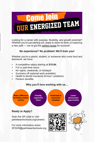 11 11Looking for a career with purpose, flexibility, and growth potential? Whether you're just starting out, ready to return to work, or exploring a new path %u2014 we%u2019ve got the perfect recipe for success!Whether you're a parent, student, or someone who loves food and teamwork, we have:%u2022 A competitive salary starting at $15.64.%u2022 Full or part-time hours.%u2022 No nights, weekends, or holidays!%u2022 Summers off (optional work available).%u2022 Health & dental insurance (6-hour+ positions).%u2022 Pension benefits.Come JoinNo experience? No problem! We%u2019ll train you!Scan the QR code or visit:palmbeachschools.org/careers.For more information email:SFSHR@palmbeachschools.org.Ready to Apply?Why you%u2019ll love working with us%u2026