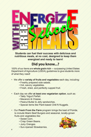 4 Students can fuel their success with delicious and nutritious meals, at no cost, designed to keep them energized and ready to learn! 4100% of our items are whole grain rich %u2014 surpassing United States Department of Agriculture (USDA) guidelines to give students more of what they need!%u2022 We offer a variety of fruits and vegetables each day, including:%u2022 Freshly prepared side salads.%u2022 Hot, savory vegetables.%u2022 Fresh, dried, and perfectly cupped fruit.%u2022 Each day we offer at least one vegetarian option, such as:%u2022 Tasty Yogurt Parfait.%u2022 Macaroni & Cheese.%u2022 Peanut Butter & Jelly sandwiches.%u2022 Special items like Plant-based Chik%u2019N Nuggets.%u2022 Our Fresh From the Farm program brings the best of Florida, to include Miami Beef Burgers and seasonal, locally-grown fruits and vegetables like:%u2022 Sweet Corn.%u2022 Crisp Green Beans.%u2022 Juicy Oranges.%u2022 Sun-ripened Strawberries.Did you know...?