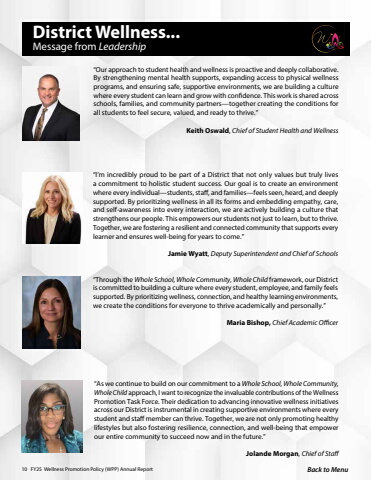 10 FY25 Wellness Promotion Policy (WPP) Annual Report PB FY25 Wellness Promotion Policy (WPP) Annual ReportMessage from LeadershipDistrict Wellness...%u201cI%u2019m incredibly proud to be part of a District that not only values but truly lives a commitment to holistic student success. Our goal is to create an environment where every individual%u2014students, staff, and families%u2014feels seen, heard, and deeply supported. By prioritizing wellness in all its forms and embedding empathy, care, and self-awareness into every interaction, we are actively building a culture that strengthens our people. This empowers our students not just to learn, but to thrive. Together, we are fostering a resilient and connected community that supports every learner and ensures well-being for years to come.%u201d Jamie Wyatt, Deputy Superintendent and Chief of Schools%u201cOur approach to student health and wellness is proactive and deeply collaborative. By strengthening mental health supports, expanding access to physical wellness programs, and ensuring safe, supportive environments, we are building a culture where every student can learn and grow with confidence. This work is shared across schools, families, and community partners%u2014together creating the conditions for all students to feel secure, valued, and ready to thrive.%u201d Keith Oswald, Chief of Student Health and Wellness%u201cThrough the Whole School, Whole Community, Whole Child framework, our District is committed to building a culture where every student, employee, and family feels supported. By prioritizing wellness, connection, and healthy learning environments, we create the conditions for everyone to thrive academically and personally.%u201d Maria Bishop, Chief Academic Officer%u201cAs we continue to build on our commitment to a Whole School, Whole Community, Whole Child approach, I want to recognize the invaluable contributions of the Wellness Promotion Task Force. Their dedication to advancing innovative wellness initiatives across our District is instrumental in creating supportive environments where every student and staff member can thrive. Together, we are not only promoting healthy lifestyles but also fostering resilience, connection, and well-being that empower our entire community to succeed now and in the future.%u201d Jolande Morgan, Chief of StaffBack to Menu