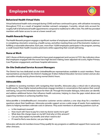 103Employee WellnessBehavioral Health Virtual Visits Virtual behavioral health visits emerged during COVID and have continued to grow, with utilization increasing throughout FY25 as a result of targeted member outreach campaigns. Currently, virtual visits account for roughly half of all behavioral health appointments compared to traditional in-office visits. This shift has provided members with faster access to care at a lower overall cost.Health Rewards ProgramThe Health Rewards program engages a significant number of employees and their spouses/domestic partners in completing a biometric screening, a health survey, and either meeting three out of five biometric markers or fulfilling a reasonable alternative. Each year, more than 10,000 employees participate in the program, earning a credit toward their health insurance premiums while supporting their overall well-being. Nurse at WorkUHC%u2019s Nurse at Work program continued to have great engagement and success in FY25. Key indicators show that employees engaged with the nurse have high decision making, lower adjusted risk scores, higher Primary Care Physician engagement, and lower hospital admissions.On-Site Dedicated Service Account Managers The District has two dedicated on-site UnitedHealthcare representatives available to assist members. These representatives are based in the District%u2019s headquaer (Fulton-Holland Education Services Center) and are also accessible virtually and by phone during normal District hours.Advocate4MeIn addition to assisting members with navigating their benefits, Advocates play a critical role in advancing health equity. These highly trained professionals engage members in conversations that explore their overall well-being, not just the immediate reason for their call. Through this broader dialogue, Advocates can identify and address additional factors that influence health outcomes, helping to close the gaps noted above and supporting members in achieving healthier lives.Advocate4Me is UnitedHealthcare%u2019s innovative customer service solution; a one stop shop for a member%u2019s questions about their healthcare. Advocates provide support across a wide range of needs, from explaining claims to helping members estimate costs in advance. They assist members in answering questions such as:%u2022 Is this treatment covered?%u2022 How much will I have to pay for a test my doctor wants me to get?%u2022 What does this charge mean on my bill? And why is it this amount?%u2022 Can you help explain my benefits and what I need to do?%u2022 If I need to find a new doctor, can you help me?Advocates will also let members know if they qualify for any programs or additional support from nurses and other clinicians.