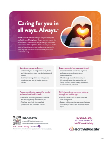 109Caring for you inall ways. Always.Health Advocate is here to help you and your family with any health or well-being issues. You get access to experts who will do the work to ensure that you get the right information and assistance at the right time. We%u2019re here for you no matter what, to help with anything you need anytime you need it, in the language and communication channel you%u2019re most comfortable using.We%u2019re not an insurance company. Health Advocate is not a direct healthcare provider, and is not affiliated with any insurance company or third party provider. %u00a92024 Health Advocate HA-ACM-2401027-2FLYSave time, money, and worry%u2022 Understand your coverage for medical, dental and vision services; know your deductibles, and copays%u2022 Get help resolving claims and billing issues, check that your out-of-pocket costs are correctAccess confidential support for mental and emotional health needs%u2022 Learn what counseling options are available and which type may work best for you%u2022 Find long-term help from qualified professionals and treatment centersExpert support when you need it most%u2022 Understand health conditions, diagnoses, and treatments; explore the latest treatment options%u2022 Work through issues that impact your life and well-being, like relationship and family conflicts, stress, anxiety, depression, substance abuse, and moreGet help anytime, anywhere online or through our mobile app %u2022 Quickly connect with an advocate in real time through chat%u2022 Explore webinars, online courses, and articles on a variety of mental and emotional health topicsCall %u2022 Email %u2022 Message %u2022 Live Chat855.424.8400answers@HealthAdvocate.comHealthAdvocate.com/palmbeachschoolsIt%u2019s OK to be OK.It%u2019s OK to not be OK.It%u2019s OK to ask for help.