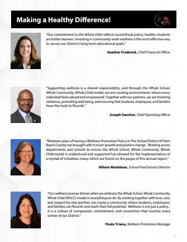 11Making a Healthy Difference!%u201cSupporting wellness is a shared responsibility, and through the Whole School, Whole Community, Whole Child model, we are creating environments where everyindividual feels valued and empowered. Together with our partners, we are fostering resilience, promoting well-being, and ensuring that students, employees, and families have the tools to flourish.%u201d Joseph Sanches, Chief Operating Officer%u201cNineteen years of having a Wellness Promotion Policy in The School District of Palm Beach County has brought with it much growth and positive change. Working across departments and schools to ensure the Whole School, Whole Community, Whole Child model is understood and supported has allowed for the implementation of a myriad of initiatives; many which are found on the pages of this annual report.%u201d Allison Monbleau, School Food Service Director%u201cOur wellness journey thrives when we embrace the Whole School, Whole Community, Whole Child (WSCC) model in everything we do. By working together with love, care, and respect for one another, we create a community where students, employees, and families can flourish and reach their full potential. Wellness is not just a policy...it is a culture of compassion, commitment, and connection that touches every corner of our District.%u201d Paula Triana, Wellness Promotion Manager%u201cOur commitment to the Whole Child reflects sound fiscal policy: healthy students are better learners. Investing in community-wide wellness is the most effective way to secure our District%u2019s long-term educational goals.%u201d Heather Frederick, Chief Financial Officer