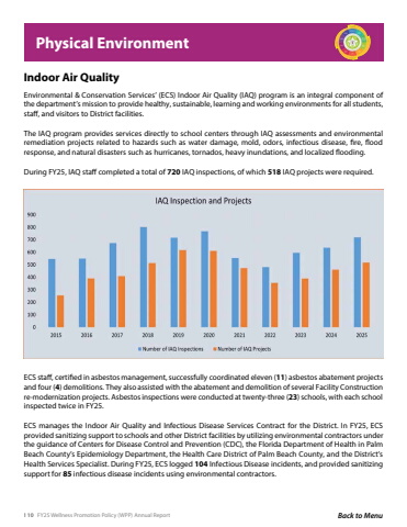 110 FY25 Wellness Promotion Policy (WPP) Annual Report Back to MenuPhysical EnvironmentEnvironmental & Conservation Services%u2019 (ECS) Indoor Air Quality (IAQ) program is an integral component of the department%u2019s mission to provide healthy, sustainable, learning and working environments for all students, staff, and visitors to District facilities. The IAQ program provides services directly to school centers through IAQ assessments and environmental remediation projects related to hazards such as water damage, mold, odors, infectious disease, fire, flood response, and natural disasters such as hurricanes, tornados, heavy inundations, and localized flooding. During FY25, IAQ staff completed a total of 720 IAQ inspections, of which 518 IAQ projects were required.Indoor Air QualityECS staff, certified in asbestos management, successfully coordinated eleven (11) asbestos abatement projects and four (4) demolitions. They also assisted with the abatement and demolition of several Facility Construction re-modernization projects. Asbestos inspections were conducted at twenty-three (23) schools, with each school inspected twice in FY25.ECS manages the Indoor Air Quality and Infectious Disease Services Contract for the District. In FY25, ECS provided sanitizing support to schools and other District facilities by utilizing environmental contractors under the guidance of Centers for Disease Control and Prevention (CDC), the Florida Department of Health in Palm Beach County%u2019s Epidemiology Department, the Health Care District of Palm Beach County, and the District%u2019s Health Services Specialist. During FY25, ECS logged 104 Infectious Disease incidents, and provided sanitizing support for 85 infectious disease incidents using environmental contractors.