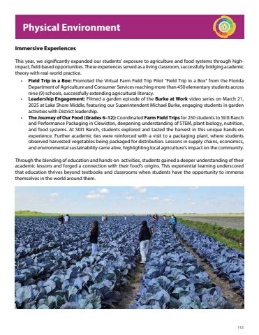 115Immersive ExperiencesThis year, we significantly expanded our students%u2019 exposure to agriculture and food systems through highimpact, field-based opportunities. These experiences served as a living classroom, successfully bridging academic theory with real-world practice. %u2022 Field Trip in a Box: Promoted the Virtual Farm Field Trip Pilot %u201cField Trip in a Box%u201d from the Florida Department of Agriculture and Consumer Services reaching more than 450 elementary students across nine (9) schools, successfully extending agricultural literacy.%u2022 Leadership Engagement: Filmed a garden episode of the Burke at Work video series on March 21, 2025 at Lake Shore Middle, featuring our Superintendent Michael Burke, engaging students in garden activities with District leadership.%u2022 The Journey of Our Food (Grades 6%u201312): Coordinated Farm Field Trips for 250 students to Stitt Ranch and Performance Packaging in Clewiston, deepening understanding of STEM, plant biology, nutrition, and food systems. At Stitt Ranch, students explored and tasted the harvest in this unique hands-on experience. Further academic ties were reinforced with a visit to a packaging plant, where students observed harvested vegetables being packaged for distribution. Lessons in supply chains, economics, and environmental sustainability came alive, highlighting local agriculture%u2019s impact on the community.Through the blending of education and hands-on activities, students gained a deeper understanding of their academic lessons and forged a connection with their food%u2019s origins. This experiential learning underscored that education thrives beyond textbooks and classrooms when students have the opportunity to immerse themselves in the world around them.Physical Environment