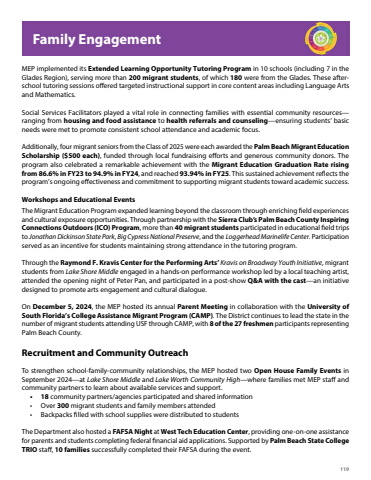 119MEP implemented its Extended Learning Opportunity Tutoring Program in 10 schools (including 7 in the Glades Region), serving more than 200 migrant students, of which 180 were from the Glades. These afterschool tutoring sessions offered targeted instructional support in core content areas including Language Arts and Mathematics.Social Services Facilitators played a vital role in connecting families with essential community resources%u2014ranging from housing and food assistance to health referrals and counseling%u2014ensuring students%u2019 basic needs were met to promote consistent school attendance and academic focus.Additionally, four migrant seniors from the Class of 2025 were each awarded the Palm Beach Migrant Education Scholarship ($500 each), funded through local fundraising efforts and generous community donors. The program also celebrated a remarkable achievement with the Migrant Education Graduation Rate rising from 86.6% in FY23 to 94.9% in FY24, and reached 93.94% in FY25. This sustained achievement reflects the program%u2019s ongoing effectiveness and commitment to supporting migrant students toward academic success. Workshops and Educational EventsThe Migrant Education Program expanded learning beyond the classroom through enriching field experiences and cultural exposure opportunities. Through partnership with the Sierra Club%u2019s Palm Beach County Inspiring Connections Outdoors (ICO) Program, more than 40 migrant students participated in educational field trips to Jonathan Dickinson State Park, Big Cypress National Preserve, and the Loggerhead Marinelife Center. Participation served as an incentive for students maintaining strong attendance in the tutoring program.Through the Raymond F. Kravis Center for the Performing Arts%u2019 Kravis on Broadway Youth Initiative, migrant students from Lake Shore Middle engaged in a hands-on performance workshop led by a local teaching artist, attended the opening night of Peter Pan, and participated in a post-show Q&A with the cast%u2014an initiative designed to promote arts engagement and cultural dialogue.On December 5, 2024, the MEP hosted its annual Parent Meeting in collaboration with the University of South Florida%u2019s College Assistance Migrant Program (CAMP). The District continues to lead the state in the number of migrant students attending USF through CAMP, with 8 of the 27 freshmen participants representing Palm Beach County.Recruitment and Community OutreachTo strengthen school-family-community relationships, the MEP hosted two Open House Family Events in September 2024%u2014at Lake Shore Middle and Lake Worth Community High%u2014where families met MEP staff and community partners to learn about available services and support.%u2022 18 community partners/agencies participated and shared information%u2022 Over 300 migrant students and family members attended%u2022 Backpacks filled with school supplies were distributed to studentsThe Department also hosted a FAFSA Night at West Tech Education Center, providing one-on-one assistance for parents and students completing federal financial aid applications. Supported by Palm Beach State College TRIO staff, 10 families successfully completed their FAFSA during the event.Family Engagement