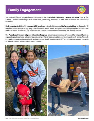 120 FY25 Wellness Promotion Policy (WPP) Annual Report Back to MenuFamily EngagementThe program further engaged the community at the Festival de Familia on October 19, 2024, held at the Samuel J. Ferreri Community Park in Greenacres, promoting awareness of educational services and community resources.On December 6, 2024, 75 migrant VPK students attended the annual Jefferson Jubilee at Alexander W. Dreyfoos School of the Arts, enjoying a day filled with music, lunch, and gifts provided by Dreyfoos students and staff%u2014an event that fosters joy, inclusion, and cross-cultural connections during the holiday season.The Palm Beach County Migrant Education Program remains a cornerstone of support for migrant families, expanding outreach and reinforcing partnerships that bridge education and community well-being. Through innovative programming, academic assistance, and family engagement, MEP continues to empower students to achieve success and thrive in District schools.