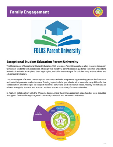 121The Department of Exceptional Student Education (ESE) leverages Parent University as a key resource to support families of students with disabilities. Through this initiative, parents receive guidance to better understand individualized education plans, their legal rights, and effective strategies for collaborating with teachers and school administrators.The primary goal of Parent University is to empower and educate parents by providing practical information and tools that promote student success. Training topics include special education laws, advocacy skills, effective collaboration, and strategies to support students%u2019 behavioral and emotional needs. Weekly workshops are offered in English, Spanish, and Haitian Creole to ensure accessibility for diverse families.In FY25, in collaboration with the Welcome Center, more than 50 engagement opportunities were provided to support families through targeted community outreach and awareness initiatives.Exceptional Student Education Parent UniversityFamily Engagement