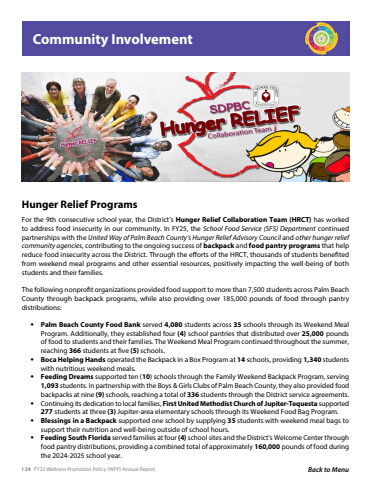 124 FY25 Wellness Promotion Policy (WPP) Annual Report Back to MenuCommunity InvolvementHunger Relief ProgramsFor the 9th consecutive school year, the District%u2019s Hunger Relief Collaboration Team (HRCT) has worked to address food insecurity in our community. In FY25, the School Food Service (SFS) Department continued partnerships with the United Way of Palm Beach County%u2019s Hunger Relief Advisory Council and other hunger relief community agencies, contributing to the ongoing success of backpack and food pantry programs that help reduce food insecurity across the District. Through the efforts of the HRCT, thousands of students benefited from weekend meal programs and other essential resources, positively impacting the well-being of both students and their families.The following nonprofit organizations provided food support to more than 7,500 students across Palm Beach County through backpack programs, while also providing over 185,000 pounds of food through pantry distributions: %u008a Palm Beach County Food Bank served 4,080 students across 35 schools through its Weekend Meal Program. Additionally, they established four (4) school pantries that distributed over 25,000 pounds of food to students and their families. The Weekend Meal Program continued throughout the summer, reaching 366 students at five (5) schools.%u008a Boca Helping Hands operated the Backpack in a Box Program at 14 schools, providing 1,340 students with nutritious weekend meals.%u008a Feeding Dreams supported ten (10) schools through the Family Weekend Backpack Program, serving 1,093 students. In partnership with the Boys & Girls Clubs of Palm Beach County, they also provided food backpacks at nine (9) schools, reaching a total of 336 students through the District service agreements.%u008a Continuing its dedication to local families, First United Methodist Church of Jupiter-Tequesta supported 277 students at three (3) Jupiter-area elementary schools through its Weekend Food Bag Program.%u008a Blessings in a Backpack supported one school by supplying 35 students with weekend meal bags to support their nutrition and well-being outside of school hours.%u008a Feeding South Florida served families at four (4) school sites and the District%u2019s Welcome Center through food pantry distributions, providing a combined total of approximately 160,000 pounds of food during the 2024-2025 school year.