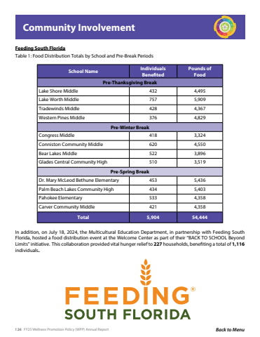 126 FY25 Wellness Promotion Policy (WPP) Annual Report Back to MenuSchool Name Individuals BenefitedPounds of FoodPre-Thanksgiving BreakLake Shore Middle 432 4,495Lake Worth Middle 757 5,909Tradewinds Middle 428 4,367Western Pines Middle 376 4,829Pre-Winter BreakCongress Middle 418 3,324Conniston Community Middle 620 4,550Bear Lakes Middle 522 3,896Glades Central Community High 510 3,519Pre-Spring BreakDr. Mary McLeod Bethune Elementary 453 5,436Palm Beach Lakes Community High 434 5,403Pahokee Elementary 533 4,358Carver Community Middle 421 4,358Total 5,904 54,444Community InvolvementFeeding South FloridaTable 1: Food Distribution Totals by School and Pre-Break PeriodsIn addition, on July 18, 2024, the Multicultural Education Department, in partnership with Feeding South Florida, hosted a food distribution event at the Welcome Center as part of their %u201cBACK TO SCHOOL Beyond Limits%u201d initiative. This collaboration provided vital hunger relief to 227 households, benefiting a total of 1,116 individuals.