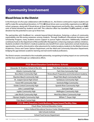 128 FY25 Wellness Promotion Policy (WPP) Annual Report Back to MenuBlood Drives in the DistrictIn the third year of a five-year collaboration with OneBlood, Inc., the District continued to inspire students and staff to make life-saving blood donations. In FY25, 80 blood drives were successfully organized across 24 high school campuses, along with 7 blood drives at three District department and facility sites, resulting in 3,691units of blood donated by students and staff. This collective effort has benefited 11,073 patients, as each donation has the potential to save up to three lives.The partnership with OneBlood, Inc. extends beyond blood donations, fostering a culture of community responsibility and life-saving awareness among students. Through OneBlood%u2019s Educational Assistance and Scholarship Program, many students receive support to pursue higher education. Additionally, OneBlood contributes funds to the Department of Risk and Benefits Management, enhancing employee wellness initiatives. Students enrolled in the District%u2019s medical academies also benefit from career exploration and job shadowing opportunities, as well as clinical and/or other placements for medical academy students to the Medical Sciences Academies, Choice and Career Options Department, and the Adult and Community Education Department, bridging the gap between academic learning and real-world medical professions.The District remains committed to this invaluable partnership, recognizing its lasting impact on our community and the lives saved through our collaborative efforts.Community InvolvementFY25 Blood Donation Contributions: SchoolsAlexander W. Dreyfoos School of the Arts Palm Beach Gardens Community HighAtlantic Community High Park Vista Community HighBoca Raton Community High Riviera Beach Preparatory and Achievement AcademyBoynton Beach Community High Royal Palm Beach Community HighDr. Joaqu%u00edn Garc%u00eda High School Santaluces Community HighForest Hill Community High Seminole Ridge CommunityGlades Central Community High Spanish River Community HighJohn I. Leonard High Suncoast HighJupiter Community High Wellington Community HighLake Worth Community High West Boca Raton Community HighOlympic Heights Community High William T. Dwyer HighPalm Beach Central HighFY25 Blood Donation Contributions: Department/Facility SitesChuck Shaw Technical Education CenterFulton-Holland Educational Services Center (Headquarters)Safe Schools InstituteSchool Food Service Department