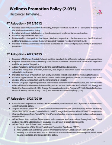 13Historical Timeline...Wellness Promotion Policy (2.035) %u008a Included the newly enacted of the Healthy, Hunger-Free Kids Act of 2010 %u2013 to expand the scope of the Wellness Promotion Policy.%u008a Included additional stakeholders in the development, implementation, and review.%u008a Included required Public Updates.%u008a Referenced to other policies that impact Wellness to provide cohesiveness across the District and additional guidance, such as the newly adopted Tobacco Free Environment (7.19).%u008a Included wellness awareness on nutrition standards for snacks and physical activity in afterschool programs.4th Adoption - 5/12/2012%u008a Required USDA Smart Snacks in Schools nutrition standards for all foods to includes vending machines.%u008a Required the establishment of Healthy School Teams to oversee compliance of Smart Snack legislation and the support of the policy.%u008a Added %u201cacademic achievement%u201d under the goal of Nutrition Education.%u008a Added the integration of health, nutrition, and physical education topics into various traditional subjects in curriculum.%u008a Included the value of hydration, sun safety practices, relaxation and stress relieving techniques.%u008a Included opportunities for outside classrooms and school gardens; and incorporating these in the designs of new construction and the renovations of schools.%u008a Revised language regarding asbestos and included other environmental hazards, and referenced to other additional environmental stewardship policies such as: the Indoor Air Quality (7.195), Energy and Water Use Conservation (7.196), Energy Conservation Incentive Program (7.1965), Waste Reduction, Materials Reuse, and Recycling (7.197), and Animals on District Property (7.24).5th Adoption - 4/22/2015%u008a Consolidated the previous Wellness Promotion Policy and the Goals and Objectives documents into one streamlined policy.%u008a Aligned with the Centers for Disease Control and Prevention%u2019s (CDC) Whole School, Whole Community, Whole Child (WSCC) Model. Created a District%u2019s WSCC image that identifies all ten (10) WSCC components.%u008a Changed language from %u201cshould%u201d to %u201cmust%u201d where feasible or where required by law, such as recess requirements.%u008a Added items from multiple Departments to increase our wellness culture throughout the District and provided the additional new language into all ten (10) WSCC components.%u008a Added District and School Level Leadershipo Continuation of the District%u2019s Wellness Promotion Task Force (WPTF).o New Creation of an Internal District Wellness Promotion Collaboration Team (WPCT).o Healthy School Team (HST) was established to ensure schools remain in compliance with Smart Snacks legislation and to support this policy.6th Adoption - 3/27/2019 13