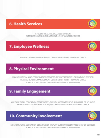 13110. Community Involvement9. Family Engagement8. Physical Environment7. Employee Wellness6. Health ServicesSTUDENT HEALTH & WELLNESS DIVISIONEXTENDED LEARNING DEPARTMENT - CHIEF ACADEMIC OFFICERISK AND BENEFITS MANAGEMENT DEPARTMENT - CHIEF FINANCIAL OFFICEENVIRONMENTAL AND CONSERVATION SERVICES (ECS) DEPARTMENT - OPERATIONS DIVISIONRISK AND BENEFITS MANAGEMENT DEPARTMENT - CHIEF FINANCIAL OFFICESCHOOL FOOD SERVICE DEPARTMENT - OPERATIONS DIVISIONMULTICULTURAL EDUCATION DEPARTMENT - DEPUTY SUPERINTENDENT AND CHIEF OF SCHOOLSEXCEPTIONAL STUDENT EDUCATION (ESE) DEPARTMENT - CHIEF ACADEMIC OFFICEMULTICULTURAL EDUCATION DEPARTMENT - DEPUTY SUPERINTENDENT AND CHIEF OF SCHOOLSSCHOOL FOOD SERVICE DEPARTMENT - OPERATIONS DIVISION 131