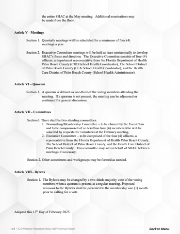 134 FY25 Wellness Promotion Policy (WPP) Annual Report Back to Menu3 the entire SHAC at the May meeting. Additional nominations may be made from the floor.Article V - Meetings Section 1. Quarterly meetings will be scheduled for a minimum of four (4) meetings a year.Section 2. Executive Committee meetings will be held at least semiannually to develop SHAC%u2019s focus and direction. The Executive Committee consists of four (4) officers, a department representative from the Florida Department of Health Palm Beach County (CHD School Health Coordinator), The School District of Palm Beach County (LEA School Health Coordinator), and the Health Care District of Palm Beach County (School Health Administrator).Article VI %u2013 QuorumSection 3. A quorum is defined as one-third of the voting members attending the meeting. If a quorum is not present, the meeting can be adjourned or continued for general discussion.Article VII - Committees Section l. There shall be two standing committees: 1. Nominating/Membership Committee %u2013 to be chaired by the Vice-Chair and to be compromised of no less than four (4) members who will be solicited by requests for volunteers at the February meeting. 2. Executive Committee %u2013 to be comprised of the four (4) officers, a representative from the Florida Department of Health Palm Beach County, The School District of Palm Beach County, and the Health Care District of Palm Beach County. This committee may act on behalf of SHAC between meetings if necessary. Section 2. Other committees and workgroups may be formed as needed.Article VIII - Bylaws Section 1. The Bylaws may be changed by a two-thirds majority vote of the voting members when a quorum is present at a regular meeting. Proposed revisions to the Bylaws shall be presented to the membership one (1) month prior to calling for a vote.Adopted this 13th Day of February 2025.