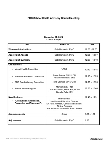 136 FY25 Wellness Promotion Policy (WPP) Annual Report Back to MenuPBC School Health Advisory Council MeetingJoin Zoom Meeting https://unitedwaypbc.zoom.us/j/85963995816?pwd=m7iTGuRKooGqiOakWbikr6jkYq7vQt.1Meeting ID: 859 6399 5816Passcode: 327114December 12, 202412:00 %u2013 1:30pmITEM PERSON TIMEWelcome/Introductions Seth Bernstein, PsyD 12:00 - 12:05Approval of Agenda Seth Bernstein, PsyD 12:05 %u2013 12:07Approval of Summary Seth Bernstein, PsyD 12:07 %u2013 12:10Old Business%u2022 Mental Health Committee Group 12:10 %u2013 12:15%u2022 Wellness Promotion Task Force Paula Triana, RDN, LDNAllison Monbleau, SNS12:15 %u2013 12:25%u2022 CDC Grant Advisory Committee%u2022 School Health ProgramPete Stewart, MPH, CPHMerris Smith, PhDLeah Eichelroth, MSN, RN, NCSNBrenda Galie, RN12:25 %u2013 12:3512:35 %u2013 12:40New Business:%u2022 \Prevention and Treatment\Hilary Loftus, Healthcare Education DirectorDr. Paul Johnson, Concussed StudentAthlete ProgramThe HOW Foundation of South Florida12:40 %u2013 1:25Announcements Group 1:25 %u2013 1:30Adjournment Seth Bernstein, PsyD 1:30Next Meeting: February 13, 2024