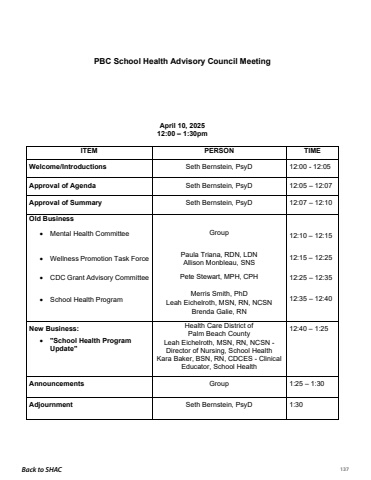 Back to SHAC 137PBC School Health Advisory Council MeetingJoin Zoom Meeting https://unitedwaypbc.zoom.us/j/88404915406?pwd=iFZgseRQOIwN4pgIVQKrhqua6uaHVT.1Meeting ID: 884 0491 5406Passcode: 308041April 10, 202512:00 %u2013 1:30pmITEM PERSON TIMEWelcome/Introductions Seth Bernstein, PsyD 12:00 - 12:05Approval of Agenda Seth Bernstein, PsyD 12:05 %u2013 12:07Approval of Summary Seth Bernstein, PsyD 12:07 %u2013 12:10Old Business%u2022 Mental Health Committee Group 12:10 %u2013 12:15%u2022 Wellness Promotion Task Force Paula Triana, RDN, LDNAllison Monbleau, SNS12:15 %u2013 12:25%u2022 CDC Grant Advisory Committee%u2022 School Health ProgramPete Stewart, MPH, CPHMerris Smith, PhDLeah Eichelroth, MSN, RN, NCSNBrenda Galie, RN12:25 %u2013 12:3512:35 %u2013 12:40New Business:%u2022 \Update\Health Care District of Palm Beach CountyLeah Eichelroth, MSN, RN, NCSN -Director of Nursing, School HealthKara Baker, BSN, RN, CDCES - Clinical Educator, School Health12:40 %u2013 1:25Announcements Group 1:25 %u2013 1:30Adjournment Seth Bernstein, PsyD 1:30Next Meeting: TBD