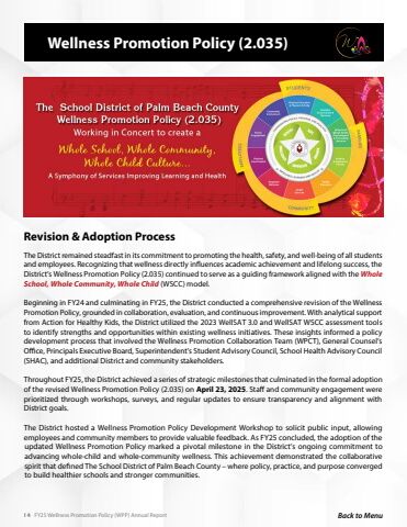 14 FY25 Wellness Promotion Policy (WPP) Annual Report Back to MenuThe District remained steadfast in its commitment to promoting the health, safety, and well-being of all students and employees. Recognizing that wellness directly influences academic achievement and lifelong success, the District%u2019s Wellness Promotion Policy (2.035) continued to serve as a guiding framework aligned with the Whole School, Whole Community, Whole Child (WSCC) model.Beginning in FY24 and culminating in FY25, the District conducted a comprehensive revision of the Wellness Promotion Policy, grounded in collaboration, evaluation, and continuous improvement. With analytical support from Action for Healthy Kids, the District utilized the 2023 WellSAT 3.0 and WellSAT WSCC assessment tools to identify strengths and opportunities within existing wellness initiatives. These insights informed a policy development process that involved the Wellness Promotion Collaboration Team (WPCT), General Counsel%u2019s Office, Principals Executive Board, Superintendent%u2019s Student Advisory Council, School Health Advisory Council (SHAC), and additional District and community stakeholders.Throughout FY25, the District achieved a series of strategic milestones that culminated in the formal adoption of the revised Wellness Promotion Policy (2.035) on April 23, 2025. Staff and community engagement were prioritized through workshops, surveys, and regular updates to ensure transparency and alignment with District goals.The District hosted a Wellness Promotion Policy Development Workshop to solicit public input, allowing employees and community members to provide valuable feedback. As FY25 concluded, the adoption of the updated Wellness Promotion Policy marked a pivotal milestone in the District%u2019s ongoing commitment to advancing whole-child and whole-community wellness. This achievement demonstrated the collaborative spirit that defined The School District of Palm Beach County %u2013 where policy, practice, and purpose converged to build healthier schools and stronger communities.Revision & Adoption ProcessWellness Promotion Policy (2.035)