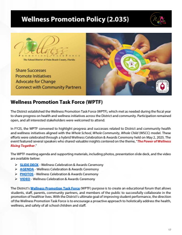 17The District established the Wellness Promotion Task Force (WPTF), which met as needed during the fiscal year to share progress on health and wellness initiatives across the District and community. Participation remained open, and all interested stakeholders were welcomed to attend. In FY25, the WPTF convened to highlight progress and successes related to District and community health and wellness initiatives aligned with the Whole School, Whole Community, Whole Child (WSCC) model. These efforts were celebrated through a hybrid Wellness Celebration & Awards Ceremony held on May 2, 2025. The event featured several speakers who shared valuable insights centered on the theme, %u201cThe Power of Wellness Rising Together.%u201dThe WPTF meeting agenda and supporting materials, including photos, presentation slide deck, and the video are available belo%u00be SLIDE DECK - Wellness Celebration & Awards Ceremony%u00be AGENDA - Wellness Celebration & Awards Ceremony%u00be PHOTOS - Wellness Celebration & Awards Ceremony%u00be VIDEO - Wellness Celebration & Awards CeremonyThe District%u2019s Wellness Promotion Task Force (WPTF) purpose is to create an educational forum that allows students, staff, parents, community partners, and members of the public to successfully collaborate in the promotion of healthier lives. With the District%u2019s ultimate goal of improving student performance, the direction of the Wellness Promotion Task Force is to encourage a proactive approach to holistically address the health, wellness, and safety of all school children and staff.Wellness Promotion Task Force (WPTF)Wellness Promotion Policy (2.035)