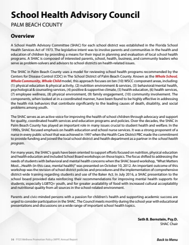 26 FY25 Wellness Promotion Policy (WPP) Annual Report Back to MenuOverviewA School Health Advisory Committee (SHAC) for each school district was established in the Florida School Health Services Act of 1973. The legislative intent was to involve parents and communities in the health and education of children by providing a means for their input in planning and evaluation of local school health programs. A SHAC is composed of interested parents, school, health, business, and community leaders who serve as problem-solvers and advisors to school districts on health-related issues.The SHAC in Palm Beach County uses a model for reviewing school health programs recommended by the Centers for Disease Control (CDC) in The School District of Palm Beach County. Known as the Whole School, Whole Community, Whole Child model, this approach focuses on ten (10) WSCC component areas, including: (1) physical education & physical activity, (2) nutrition environment & services, (3) behavioral/mental health, psychological & counseling services, (4) positive & supportive climate, (5) health education, (6) health services, (7) employee wellness, (8) physical environment, (9) family engagement, (10) community involvement. The components, when looked at in a coordinated manner, have been found to be highly effective in addressing the health risk behaviors that contribute significantly to the leading causes of death, disability, and social problems among youth.The SHAC serves as an active voice for improving the health of school children through advocacy and support for quality, coordinated health services and education programs and policies. Over the decades, the SHAC in Palm Beach County has played an important role in many issues crucial to student health and welfare. In the 1990s, SHAC focused emphasis on health education and school nurse services. It was a strong proponent of a nurse in every public school that was achieved in 1997 when the Health Care District PBC made the commitment to provide funding and joined the local school district and health department as a partner in the school health program.For many years, the SHAC%u2019s goals have been oriented to support efforts focused on nutrition, physical education and health education and included School Board workshops on those topics. The focus shifted to addressing the needs of students with behavioral and mental health concerns when the SHAC board workshop, %u201cWhat Matters Most....Health (in this case, mental health)%u201d was presented on October 10, 2012. An important outcome of this workshop was the revision of school district policies and procedures and the implementation of comprehensive district-wide training regarding students and use of the Baker Act. In July 2016, a SHAC presentation to the school board provided data reinforcing their recommendations for improving mental health supports for students, especially LGBTQ+ youth, and for greater availability of food with increased cultural acceptability and nutritional quality from all sources in the school-related environment. Parents and civic-minded persons with a passion for children%u2019s health and supporting academic success are urged to consider participation in the SHAC. The Council meets monthly during the school year with educational presentations and discussions on a wide range of important school health topics.School Health Advisory CouncilPALM BEACH COUNTYSeth B. Bernstein, Psy.D. SHAC Chair