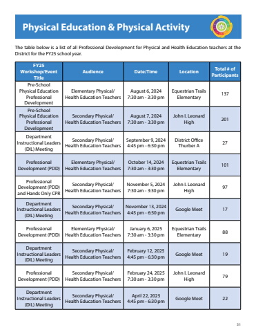 31FY25 Workshop/Event TitleAudience Date/Time Location Total # of ParticipantsPre-SchoolPhysical EducationProfessional DevelopmentElementary Physical/Health Education TeachersAugust 6, 20247:30 am - 3:30 pmEquestrian Trails Elementary 137Pre-SchoolPhysical EducationProfessional DevelopmentSecondary Physical/Health Education TeachersAugust 7, 20247:30 am - 3:30 pmJohn I. Leonard High 201Department Instructional Leaders (DIL) MeetingSecondary Physical/Health Education TeachersSeptember 9, 20244:45 pm - 6:30 pmDistrict Office Thurber A 27Professional Development (PDD)Elementary Physical/Health Education TeachersOctober 14, 20247:30 am - 3:30 pmEquestrian Trails Elementary 101Professional Development (PDD) and Hands Only CPRSecondary Physical/Health Education TeachersNovember 5, 20247:30 am - 3:30 pmJohn I. Leonard High 97Department Instructional Leaders (DIL) MeetingSecondary Physical/Health Education TeachersNovember 13, 20244:45 pm - 6:30 pm Google Meet 17Professional Development (PDD)Elementary Physical/Health Education TeachersJanuary 6, 20257:30 am - 3:30 pmEquestrian Trails Elementary 88Department Instructional Leaders (DIL) MeetingSecondary Physical/Health Education TeachersFebruary 12, 20254:45 pm - 6:30 pm Google Meet 19Professional Development (PDD)Secondary Physical/Health Education TeachersFebruary 24, 20257:30 am - 3:30 pmJohn I. Leonard High 79Department Instructional Leaders (DIL) MeetingSecondary Physical/Health Education TeachersApril 22, 20254:45 pm - 6:30 pm Google Meet 22The table below is a list of all Professional Development for Physical and Health Education teachers at the District for the FY25 school year.Physical Education & Physical Activity