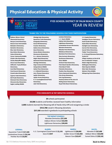 32 FY25 Wellness Promotion Policy (WPP) Annual Report Back to MenuPhysical Education & Physical ActivityFY25 SCHOOL DISTRICT OF PALM BEACH COUNTYYEAR IN REVIEW84 schools participated69,000 students and families received heart healthy information2,000 students learned the lifesaving skill of Hands-Only CPR and recognizing a stroke$415,788 raised in lifesaving donations $27,530 awarded in givebacks to participating schoolsTHANK YOU TO THE FOLLOWING SCHOOLS FOR THEIR PARTICIPATION:FY25 HIGHLIGHTS & TOP IMPACTED SCHOOLS:TOP IMPACT SCHOOLS:Manatee Elementary $37,498Addison Mizner School $32,098Lighthouse Elementary $28,985Addison Mizner SchoolAllamanda Elementary Banyan Creek Elementary Beacon Cove Intermediate Belvedere ElementaryBerkshire Elementary Blue Lake Elementary Boca Raton Elementary Calusa Elementary Carver Community Middle Cholee Lake Elementary Christa McAuliffe Middle Citrus Cove Elementary Clifford O. Taylor/KirklaneElementaryCoral Reef Elementary Coral Sunset Elementary Crystal Lakes Elementary Cypress Trails Elementary Del Prado Elementary Diamond View Elementary Discovery Key ElementaryEagles Landing MiddleElbridge Gale ElementaryEquestrian Trails Elementary Everglades Elementary Forest Hill Elementary Frontier Elementary Golden Grove Elementary Gove Elementary Grassy Waters Elementary Greenacres Elementary H. L. Johnson Elementary Hagen Road Elementary Hammock Pointe Elementary Heritage Elementary Hope-Centennial Elementary Independence Middle Indian Pines Elementary J. C. Mitchell Elementary Jerry Thomas Elementary Jupiter ElementaryJupiter Farms Elementary K. E. Cunningham/Canal Point ElementaryLake Park Elementary Lantana Elementary L. C. Swain Middle Liberty Park ElementaryLighthouse Elementary Loxahatchee Groves Elementary Manatee Elementary Meadow Park Elementary Melaleuca Elementary Morikami Park Elementary New Horizons Elementary Northmore Elementary Omni Middle Orchard View Elementary Palm Beach Gardens Elementary Palm Beach Public Palmetto Elementary Panther Run Elementary Pierce Hammock Elementary Pine Grove Elementary Pine Jog Elementary Plumosa School of the Arts K-8Rolling Green Elementary Royal Palm Beach Elementary S. D. Spady Elementary Sandpiper Shores Elementary South Grade ElementarySouth Olive Elementary Starlight Cove Elementary Sunrise Park Elementary Sunset Palms Elementary Timber Trace Elementary U. B. Kinsey/Palmview Elementary Verde K-8 Village Academy on the Art & Sara Jo Kobacker CampusWaters Edge Elementary Wellington Elementary West Boynton Middle West Gate Elementary Western Pines Middle Whispering Pines Elementary GLADES:K. E. Cunningham/Canal Point ES $1,191Gove ES $447CENTRAL:Equestrian Trails ES $17,328Loxahatchee Groves ES $6,144Panther Run ES $5,091NORTH:Lighthouse ES $28,985Golden Grove ES $16,404Beacon Cove $10,647SOUTH:Manatee ES $37,498Addison Mizner $32,098Sunset Palms ES $20,163