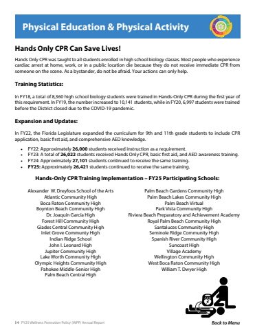 34 FY25 Wellness Promotion Policy (WPP) Annual Report Back to MenuHands-Only CPR Training Implementation %u2013 FY25 Participating Schools:Physical Education & Physical ActivityHands Only CPR Can Save Lives!Hands Only CPR was taught to all students enrolled in high school biology classes. Most people who experience cardiac arrest at home, work, or in a public location die because they do not receive immediate CPR from someone on the scene. As a bystander, do not be afraid. Your actions can only help.Training Statistics:In FY18, a total of 8,360 high school biology students were trained in Hands-Only CPR during the first year of this requirement. In FY19, the number increased to 10,141 students, while in FY20, 6,997 students were trained before the District closed due to the COVID-19 pandemic.Expansion and Updates:In FY22, the Florida Legislature expanded the curriculum for 9th and 11th grade students to include CPR application, basic first aid, and comprehensive AED knowledge.%u2022 FY22: Approximately 26,000 students received instruction as a requirement.%u2022 FY23: A total of 26,022 students received Hands Only CPR, basic first aid, and AED awareness training.%u2022 FY24: Approximately 27,101 students continued to receive the same training.%u2022 FY25: Approximately 26,421 students continued to receive the same training.Alexander W. Dreyfoos School of the ArtsAtlantic Community HighBoca Raton Community HighBoynton Beach Community HighDr. Joaqu%u00edn Garc%u00eda High Forest Hill Community HighGlades Central Community HighInlet Grove Communty High Indian Ridge SchoolJohn I. Leonard HighJupiter Community HighLake Worth Community HighOlympic Heights Community HighPahokee Middle-Senior HighPalm Beach Central HighPalm Beach Gardens Community HighPalm Beach Lakes Community HighPalm Beach Virtual Park Vista Community HighRiviera Beach Preparatory and Achievement AcademyRoyal Palm Beach Community HighSantaluces Community HighSeminole Ridge Community HighSpanish River Community HighSuncoast HighVillage AcademyWellington Community HighWest Boca Raton Community HighWilliam T. Dwyer High