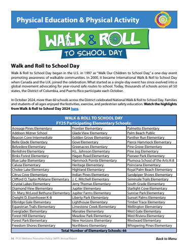 36 FY25 Wellness Promotion Policy (WPP) Annual Report Back to MenuPhysical Education & Physical ActivityWalk and Roll to School DayWalk & Roll to School Day began in the U.S. in 1997 as %u201cWalk Our Children to School Day,%u201d a one-day event promoting awareness of walkable communities. In 2000, it became International Walk & Roll to School Day when Canada and the U.K. joined the celebration. What started as a single-day event has since evolved into a global movement advocating for year-round safe routes to school. Today, thousands of schools across all 50 states, the District of Columbia, and Puerto Rico participate each October.In October 2024, more than 60 schools across the District celebrated National Walk & Roll to School Day. Families and students of all ages enjoyed the festivities, exercise, and pedestrian safety education. Watch the highlights from Walk & Roll to School Day 2024 here.WALK & ROLL TO SCHOOL DAYFY25 Participating Elementary Schools:Acreage Pines Elementary Frontier Elementary Palmetto ElementaryAddison Mizner School Glade View Elementary Palm Beach PublicBeacon Cove Intermediate Golden Grove Elementary Panther Run ElementaryBelle Glade Elementary Gove Elementary Pierce Hammock ElementaryBelvedere Elementary Greenacres Elementary Pine Grove ElementaryBerkshire Elementary H.L. Johnson Elementary Pine Jog ElementaryBinks Forest Elementary Hagen Road Elementary Pioneer Park ElementaryBlue Lake Elementary Hammock Pointe Elementary Plumosa School of the Arts K-8Calusa Elementary Heritage Elementary Poinciana ElementaryCholee Lake Elementary Highland Elementary Royal Palm Beach ElementaryCitrus Cove Elementary Indian Pines Elementary Sandpiper Shores ElementaryClifford O. Taylor/Kirklane Elementary J. C. Mitchell Elementary Seminole Trails ElementaryCrystal Lakes Elementary Jerry Thomas Elementary South Grade ElementaryDiamond View Elementary Jupiter Elementary Starlight Cove ElementaryDr. Mary McLeod Bethune Elementary Jupiter Farms Elementary Sunrise Park ElementaryDwight D. Eisenhower K-8 Liberty Park Elementary Sunset Palms ElementaryElbridge Gale Elementary Lighthouse Elementary Timber Trace ElementaryEquestrian Trails Elementary Limestone Creek Elementary Wellington ElementaryEverglades Elementary Manatee Elementary West Gate ElementaryForest Hill Elementary Meadow Park Elementary West Riviera ElementaryForest Park Elementary New Horizons Elementary Westward ElementaryFreedom Shores Elementary Northboro Elementary Whispering Pines ElementaryTotal Number of Elementary Schools: 66