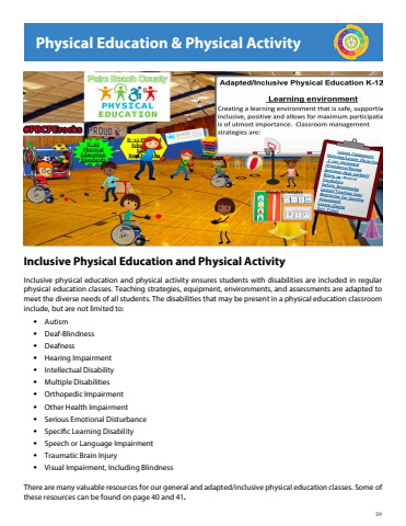 39Inclusive Physical Education and Physical ActivityInclusive physical education and physical activity ensures students with disabilities are included in regular physical education classes. Teaching strategies, equipment, environments, and assessments are adapted to meet the diverse needs of all students. The disabilities that may be present in a physical education classroom include, but are not limited to:%u008a Autism%u008a Deaf-Blindness%u008a Deafness%u008a Hearing Impairment%u008a Intellectual Disability%u008a Multiple Disabilities%u008a Orthopedic Impairment%u008a Other Health Impairment%u008a Serious Emotional Disturbance%u008a Specific Learning Disability%u008a Speech or Language Impairment%u008a Traumatic Brain Injury%u008a Visual Impairment, Including BlindnessThere are many valuable resources for our general and adapted/inclusive physical education classes. Some of these resources can be found on page 40 and 41.Physical Education & Physical Activity