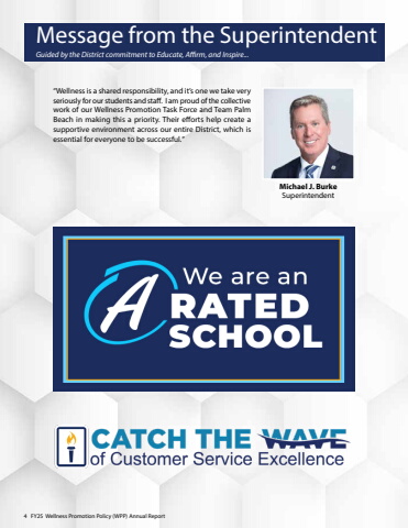 PB FY25 Wellness Promotion Policy (WPP) Annual ReportGuided by the District commitment to Educate, Affirm, and Inspire...%u201cWellness is a shared responsibility, and it%u2019s one we take very seriously for our students and staff. I am proud of the collective work of our Wellness Promotion Task Force and Team Palm Beach in making this a priority. Their efforts help create a supportive environment across our entire District, which is essential for everyone to be successful.%u201dMessage from the Superintendent Michael J. Burke Superintendent4 FY25 Wellness Promotion Policy (WPP) Annual Report