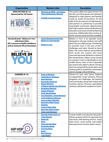 40 FY25 Wellness Promotion Policy (WPP) Annual Report Back to MenuOrganization Website Links DescriptionOPEN PHYSED (K-12)Sponsored by: US Games%u2022 Welcome to OPEN %u2013 the Online Physical Education Network%u2022 PE NOW YouTube PlaylistThis section offers two types of tools. On the left, you%u2019ll find games and calendars designed to help parents and families create an active environment. On the right, there are resources to help teachers and parents in partnering to provide meaningful movement opportunities that help students achieve both physical education and social-emotional learning outcomes. Additionally, there are free athome summer camp activities available.Varsity Brands: %u201cBelieve in You%u201d with Kevin AtlasSEL resource to build confidence and an inclusive PE environment%u2022 Varsity Brands Presents the Believe in You Program%u2022 Believe in YouBelieve in You%u00ae is an episodic series designed to educate students and staff about the incredible power of believing in yourself, even in the face of life%u2019s challenges and trials. Hosted by Kevin Atlas, the series features personalities from across the country who have overcome personal obstacles to achieve the extraordinary. Videos can be viewed as a group in class or individually on any mobile device. Each of the 9 episodes per season lasts eight to eleven minutes and is accompanied by lesson plans and activity guides to extend the conversation and encourage critical thinking.DAREBEE (K-12) %u2022 Super X Workout%u2022 Seated Boxer Workout%u2022 Neck Workout%u2022 Rainmaker Workout%u2022 Binary Workout%u2022 3 Minute Seated Yoga Workout%u2022 Breathing Workout%u2022 Stapler Workout%u2022 Chair Abs Workout%u2022 Sun Salutation / Chair Workout%u2022 Catch & Release Workout%u2022 Arms of Steel [SEATED]%u2022 Back Pain Relief (Chair)%u2022 Darebee%u2022 Arms of Steel Chair%u2022 Back Pain Relief (Chair)%u2022 Chair Cycle WorkoutFitness on your own terms: Explore no-equipment visual workouts, fitness programs, and challenges. Get training and running tips, along with recipes and nutrition advice. Discover specialized workouts tailored for students in chairs.%u2022 Hip Hop Public H.E.A.L.S%u2022 Yaaas Bounce %u2022 Knees Up%u2022 Drive%u2022 Show Em How Now%u2022 Round the World %u2022 Flow the Wave%u2022 Brush%u2022 Basic Bounce %u2022 Lean MasterA great health and physical education literacy program which incorporates hip hop music, with learning and fun. Enjoy their music, comic books, and videos featuring some inclusive dance moves.