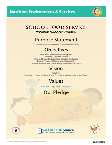 42 FY25 Wellness Promotion Policy (WPP) Annual Report Back to MenuObjectivesFeed Kids/ Increase Meal ParticipationEnhance Customer ServiceHire and Retain Dedicated and Effective EmployeesEnsure Program Efficiency and AccountabilityEnhance Wellness and Sustainability Throughout the DistrictPurpose StatementKids FirstCommitted to Being the Best School Food Service Department in the CountryVisionOur PledgeValuesTo provide nutritious meals and promote healthful livingof Customer Service ExcellencePassion Quality Respect Nutrition Environment & Services