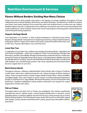 44 FY25 Wellness Promotion Policy (WPP) Annual Report Back to MenuHappy Lunar New Happy Lunar NewYear! Year!Enjoy the Enjoy theChicken Ramen Bowl Chicken Ramen Bowlwith Egg Roll with Egg RollHispanic Heritage MonthFrom September 15 to October 15, 2024, students embarked on a flavorful journey during Hispanic Heritage Month. Featured items included Guava Pastries, Chicken Verde Rice Bowls, Empanadas, Burritos, Arepas with Carnitas and Curtido, along with traditional favorites such as Soft Tacos, Pupusas, Black Beans, Yuca, and Fiesta Corn.Lunar New YearIn celebration of Lunar New Year, students were introduced to Ramen Bowls%u2014Beef & Broccoli and Chicken & Vegetable%u2014which were sampled at Timber Trace Elementary, Elbridge Gale Elementary, and Bear Lakes Middle. Elbridge Gale Elementary hosted the District%u2019s media team during the Chicken & Vegetable Ramen Bowl launch, and Independence Middle welcomed the Woodles Ramen Company Team for the Beef & Broccoli Ramen Bowl rollout. Student and staff feedback was overwhelmingly positive, with many requesting that the Ramen Bowls become a regular item on our menu.Black History MonthThroughout February, cafeterias celebrated Black History Month with a lineup of Southern comfort food, which were crafted honoring the rich culinary heritage of African American culture. These included Southern Chicken Poppers Mashed Potato Bowl, Chicken & Waffles, and Baked Apples. Items were tested at several schools, including Allamanda Elementary, Dwight D. Eisenhower K-8, Jeaga Middle, Westward Elementary, and U.B. Kinsey/Palm View Elementary. Feedback highlighted strong student enthusiasm and requests for repeat appearances of these menu items. Fish on FridaysThroughout March and April, Fish on Fridays was spotlighted. This initiative significantly expanded the menu%u2019s seafood variety, moving beyond standard fare to introduce several appealing options. A standout addition was the new Fish Taco, which proved to be an instant favorite among students. This dish featured crispy, tender fish served in a soft tortilla, topped with a bright, crunchy coleslaw and finished with a creamy, special sauce that added a distinct, zesty flavor.NEW FEATURED RECIPES JOININGRETURNING FAVORITES:CHICKEN & WAFFLECINNAMON APPLESCOUNTRY FRIED CHICKEN & MASHEDPOTATO BOWLBLACKMONTHHISTORYFERUARY 1-28, 2025Flavors Without Borders: Exciting New Menu ChoicesSchool Food Service (SFS) proudly showcased a rich tapestry of culinary traditions throughout FY25 by celebrating various cultural holidays, observances, and special food days. This allowed our students to explore new flavors, learn about traditions from around the world, and celebrate food in a whole new way. Student feedback played a key role in shaping these menu offerings, ensuring they were well-received and aligned with student preferences. These initiatives enhance the school meal program, fostering greater cultural awareness and enriching the dining experience.Nutrition Environment & Services