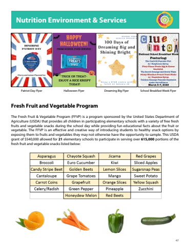 47Increase Meal ParticipationFresh Fruit and Vegetable ProgramThe Fresh Fruit & Vegetable Program (FFVP) is a program sponsored by the United States Department of Agriculture (USDA) that provides all children in participating elementary schools with a variety of free fresh fruits and vegetable snacks during the school day while providing fun educational facts about the fruit or vegetable. The FFVP is an effective and creative way of introducing students to healthy snack options by exposing them to fruits and vegetables they may not otherwise have the opportunity to sample. This USDA grant of $540,000 allowed for 21 elementary schools to participate in serving over 615,000 portions of the fresh fruit and vegetable snacks listed beloPatriot Day Flyer Halloween Flyer Dreaming Big Flyer School Breakfast Week Flyer Nutrition Environment & Services