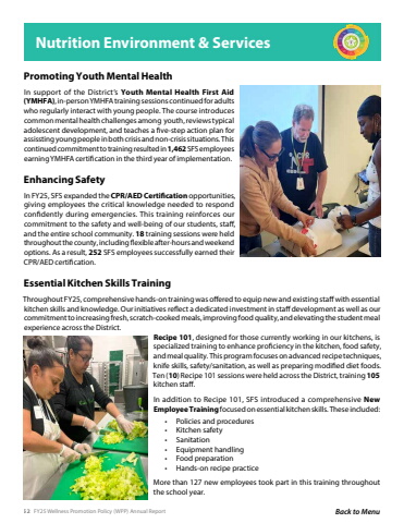 52 FY25 Wellness Promotion Policy (WPP) Annual Report Back to MenuPromoting Youth Mental Health In support of the District%u2019s Youth Mental Health First Aid (YMHFA), in-person YMHFA training sessions continued for adults who regularly interact with young people. The course introduces common mental health challenges among youth, reviews typical adolescent development, and teaches a five-step action plan for assissting young people in both crisis and non-crisis situations. This continued commitment to training resulted in 1,462 SFS employees earning YMHFA certification in the third year of implementation.Enhancing SafetyIn FY25, SFS expanded the CPR/AED Certification opportunities, giving employees the critical knowledge needed to respond confidently during emergencies. This training reinforces our commitment to the safety and well-being of our students, staff, and the entire school community. 18 training sessions were held throughout the county, including flexible after-hours and weekend options. As a result, 252 SFS employees successfully earned their CPR/AED certification.Essential Kitchen Skills TrainingThroughout FY25, comprehensive hands-on training was offered to equip new and existing staff with essential kitchen skills and knowledge. Our initiatives reflect a dedicated investment in staff development as well as our commitment to increasing fresh, scratch-cooked meals, improving food quality, and elevating the student meal experience across the District.Recipe 101, designed for those currently working in our kitchens, is specialized training to enhance proficiency in the kitchen, food safety, and meal quality. This program focuses on advanced recipe techniques, knife skills, safety/sanitation, as well as preparing modified diet foods. Ten (10) Recipe 101 sessions were held across the District, training 105kitchen staff.In addition to Recipe 101, SFS introduced a comprehensive New Employee Training focused on essential kitchen skills. These included: More than 127 new employees took part in this training throughout the school year.%u2022 Policies and procedures%u2022 Kitchen safety%u2022 Sanitation%u2022 Equipment handling%u2022 Food preparation%u2022 Hands-on recipe practiceNutrition Environment & Services