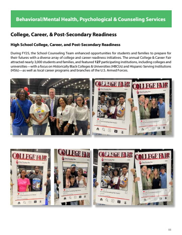 55Behavioral/Mental Health, Psychological & Counseling ServicesCollege, Career, & Post-Secondary ReadinessHigh School College, Career, and Post-Secondary ReadinessDuring FY25, the School Counseling Team enhanced opportunities for students and families to prepare for their futures with a diverse array of college and career readiness initiatives. The annual College & Career Fair attracted nearly 3,000 students and families, and featured 127 participating institutions, including colleges and universities%u2014with a focus on Historically Black Colleges & Universities (HBCUs) and Hispanic-Serving Institutions (HSIs)%u2014as well as local career programs and branches of the U.S. Armed Forces.