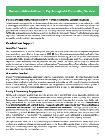 57State-Mandated Instruction (Resiliency, Human Trafficking, Substance Abuse)School counselors support the implementation of state-mandated instruction on substance abuse and child trafficking prevention education, and resiliency education. Students in grades K%u201312 received age-appropriate lessons on child trafficking and substance abuse awareness and prevention, while students in grades 6%u201312 were provided with the required five hours of annual resiliency education. These lessons were delivered through ReThink Ed and supplemented with resources from the District%u2019s Community Agency Toolkit. By leveraging both digital and community-based resources, the School Counseling Team ensured that instruction was engaging, accessible, and aligned with state standards.Graduation SupportJumpStart ProgramThe District continued its JumpStart Programs, designed to accelerate students who were performing below their grade-level cohort. During the summer of 2024, 27 rising 9th graders participated in JumpStart to High School, with 19 successfully promoted to the next grade level. Additionally, 26 rising 6th graders participated in JumpStart to Middle School, with 22 successfully transitioning to the next grade level. These programs directly impacted student wellness by reducing retention, restoring student confidence, and ensuring that vulnerable students remained on track toward high school graduation. The success of JumpStart reflects a collaborative effort among school counselors, administrators, teachers, and district staff, reinforcing a commitment to equity and opportunity for all students.Graduation CoachesLiteracy AmeriCorps Graduation Coaches served at four comprehensive high shools%u2014Boynton Beach Community High, Forest Hill Community High, Lake Worth Community High, and Palm Beach Lakes Community High%u2014where they provided academic monitoring, attendance support, and assistance with removing barriers for students at risk of not graduating. Their presence ensured that struggling students received individualized guidance and resources to help them meet graduation requirements and prepare for post-secondary pathways.Family & Community EngagementFamily and community partnerships played a pivotal role in the District%u2019s school counseling initiatives in FY25. The District School Counseling Team initiated virtual meetings known as FACES (Family and Caregiver Engagement Sessions) to empower parents and caregivers with strategies that promote their child%u2019s wellbeing and academic success. Four virtual sessions were conducted, covering topics such as %u201cStrengthening Your Child%u2019s Mental Health and Well-being,%u201d %u201cSupporting Healthy Social Media Use,%u201d %u201cHuman Trafficking Awareness and Prevention,%u201d and %u201cStudent Mental Health and Awareness.%u201d The objective was to enhance participant knowledge by at least 70%, as assessed through post-workshop surveys. The results significantly surpassed this goal, with 92.86% of participants reporting that the sessions helped them support their child either %u201cSignificantly%u201d or %u201cModerately.%u201d The success of this program can be attributed to expert presenters, promotion through schools, and the creation of a FACES webpage that provides ongoing resources.Through these initiatives, the School Counseling Team demonstrated its commitment to advancing student wellness and academic achievement across all grade levels. By combining data-driven practices with strong family and community partnerships, counselors supported students academically, strengthened resiliency, and laid a foundation for continued success.Behavioral/Mental Health, Psychological & Counseling Services