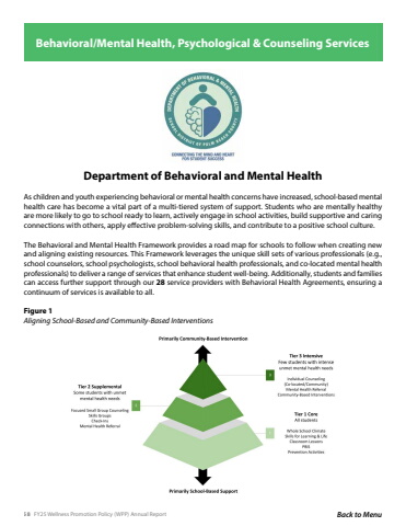 58 FY25 Wellness Promotion Policy (WPP) Annual Report Back to MenuDepartment of Behavioral and Mental Health As children and youth experiencing behavioral or mental health concerns have increased, school-based mental health care has become a vital part of a multi-tiered system of support. Students who are mentally healthy are more likely to go to school ready to learn, actively engage in school activities, build supportive and caring connections with others, apply effective problem-solving skills, and contribute to a positive school culture.The Behavioral and Mental Health Framework provides a road map for schools to follow when creating new and aligning existing resources. This Framework leverages the unique skill sets of various professionals (e.g., school counselors, school psychologists, school behavioral health professionals, and co-located mental health professionals) to deliver a range of services that enhance student well-being. Additionally, students and families can access further support through our 28 service providers with Behavioral Health Agreements, ensuring a continuum of services is available to all.Figure 1Aligning School-Based and Community-Based InterventionsBehavioral/Mental Health, Psychological & Counseling Services