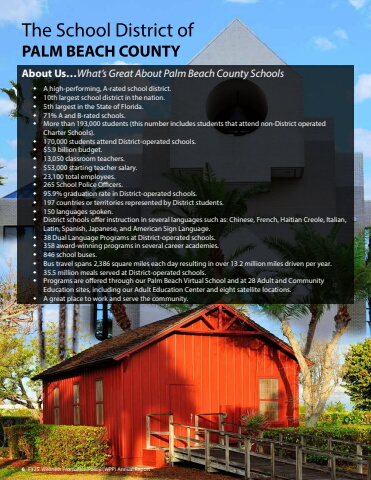 6 FY25 Wellness Promotion Policy (WPP) Annual ReportAbout Us%u2026What%u2019s Great About Palm Beach County Schools%u008a A high-performing, A-rated school district.%u008a 10th largest school district in the nation.%u008a 5th largest in the State of Florida.%u008a 71% A and B-rated schools.%u008a More than 193,000 students (this number includes students that attend non-District operated Charter Schools).%u008a 170,000 students attend District-operated schools. %u008a $5.9 billion budget.%u008a 13,050 classroom teachers.%u008a $53,000 starting teacher salary.%u008a 23,100 total employees.%u008a 265 School Police Officers.%u008a 95.9% graduation rate in District-operated schools.%u008a 197 countries or territories represented by District students.%u008a 150 languages spoken.%u008a District schools offer instruction in several languages such as: Chinese, French, Haitian Creole, Italian, Latin, Spanish, Japanese, and American Sign Language.%u008a 38 Dual Language Programs at District-operated schools.%u008a 358 award-winning programs in several career academies.%u008a 846 school buses.%u008a Bus travel spans 2,386 square miles each day resulting in over 13.2 million miles driven per year.%u008a 35.5 million meals served at District-operated schools.%u008a Programs are offered through our Palm Beach Virtual School and at 28 Adult and Community Education sites, including our Adult Education Center and eight satellite locations.%u008a A great place to work and serve the community.
