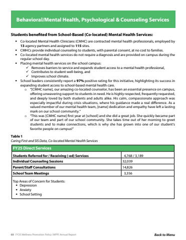 60 FY25 Wellness Promotion Policy (WPP) Annual Report Back to MenuFY25 Direct ServicesStudents Referred for / Receiving (-ed) Services 4,768 / 3,189Individual Counseling Sessions 32,039Parent/Staff Consultations 14,826School Team Meetings 3,356Top Areas of Concern for Students:%u008a Depression%u008a Anxiety%u008a School SettingTable 1Caring First and SIS Data, Co-located Mental Health ServicesStudents benefited from School-Based (Co-located) Mental Health Services:%u008a Co-located Mental Health Clinicians (CMHC) are contracted mental health professionals, employed by 13 agency partners and assigned to 115 sites. %u008a CMHCs provide individual counseling to students, with parental consent, at no cost to families.%u008a Co-located mental health services do not require a diagnosis and are provided on campus during the regular school day. %u008a Placing mental health services on the school campus:9 Removes barriers to service and expands student access to a mental health professional,9 Contributes to student well-being, and9 Improves school climate.%u008a School leaders consistently report a 97% positive rating for this initiative, highlighting its success in expanding student access to school-based mental health care.o %u201c[CMHC name], our amazing co-located counselor, has been an essential presence on campus, offering unwavering support to students in need. He is highly respected, frequently requested, and deeply loved by both students and adults alike. His calm, compassionate approach was especially impactful during crisis situations, where his guidance made a real difference. As a valued member of our mental health team, [name] dedication and empathy have left a lasting mark on our school community.%u201do %u201cThis was [CMHC name] first year at [school] and she did a great job. She quickly became part of our team and part of our school community. She takes time out of her morning to greet students and to make connections, which is why she has grown into one of our student%u2019s favorite people on campus!%u201dBehavioral/Mental Health, Psychological & Counseling Services