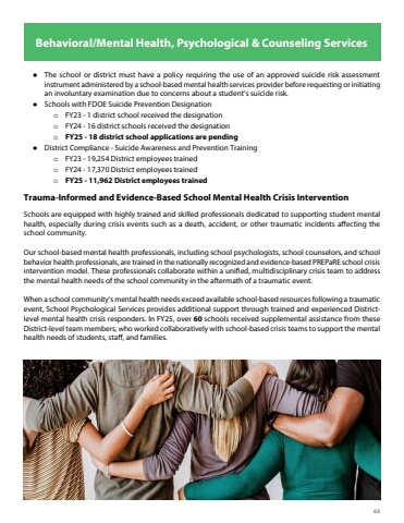 63Behavioral/Mental Health, Psychological & Counseling ServicesTrauma-Informed and Evidence-Based School Mental Health Crisis InterventionSchools are equipped with highly trained and skilled professionals dedicated to supporting student mental health, especially during crisis events such as a death, accident, or other traumatic incidents affecting the school community.Our school-based mental health professionals, including school psychologists, school counselors, and school behavior health professionals, are trained in the nationally recognized and evidence-based PREPaRE school crisis intervention model. These professionals collaborate within a unified, multidisciplinary crisis team to address the mental health needs of the school community in the aftermath of a traumatic event.When a school community%u2019s mental health needs exceed available school-based resources following a traumatic event, School Psychological Services provides additional support through trained and experienced Districtlevel mental health crisis responders. In FY25, over 60 schools received supplemental assistance from these District-level team members, who worked collaboratively with school-based crisis teams to support the mental health needs of students, staff, and families.%u25cf The school or district must have a policy requiring the use of an approved suicide risk assessment instrument administered by a school-based mental health services provider before requesting or initiating an involuntary examination due to concerns about a student%u2019s suicide risk.%u25cf Schools with FDOE Suicide Prevention Designationo FY23 - 1 district school received the designationo FY24 - 16 district schools received the designation o FY25 - 18 district school applications are pending%u25cf District Compliance - Suicide Awareness and Prevention Trainingo FY23 - 19,254 District employees trained o FY24 - 17,370 District employees trainedo FY25 - 11,962 District employees trained