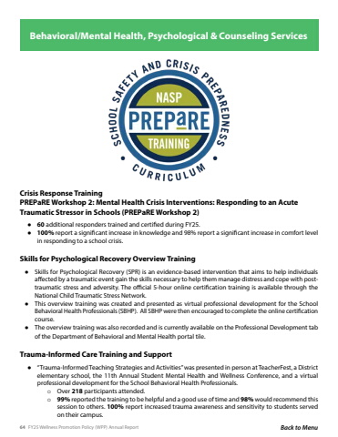 64 FY25 Wellness Promotion Policy (WPP) Annual Report Back to MenuBehavioral/Mental Health, Psychological & Counseling ServicesCrisis Response TrainingPREPaRE Workshop 2: Mental Health Crisis Interventions: Responding to an Acute Traumatic Stressor in Schools (PREPaRE Workshop 2)%u25cf 60 additional responders trained and certified during FY25.%u25cf 100% report a significant increase in knowledge and 98% report a significant increase in comfort level in responding to a school crisis.Skills for Psychological Recovery Overview Training%u25cf Skills for Psychological Recovery (SPR) is an evidence-based intervention that aims to help individuals affected by a traumatic event gain the skills necessary to help them manage distress and cope with posttraumatic stress and adversity. The official 5-hour online certification training is available through the National Child Traumatic Stress Network.%u25cf This overview training was created and presented as virtual professional development for the School Behavioral Health Professionals (SBHP). All SBHP were then encouraged to complete the online certification course.%u25cf The overview training was also recorded and is currently available on the Professional Development tab of the Department of Behavioral and Mental Health portal tile.Trauma-Informed Care Training and Support %u25cf %u201cTrauma-Informed Teaching Strategies and Activities%u201d was presented in person at TeacherFest, a District elementary school, the 11th Annual Student Mental Health and Wellness Conference, and a virtual professional development for the School Behavioral Health Professionals.o Over 218 participants attended.o 99% reported the training to be helpful and a good use of time and 98% would recommend this session to others. 100% report increased trauma awareness and sensitivity to students served on their campus.