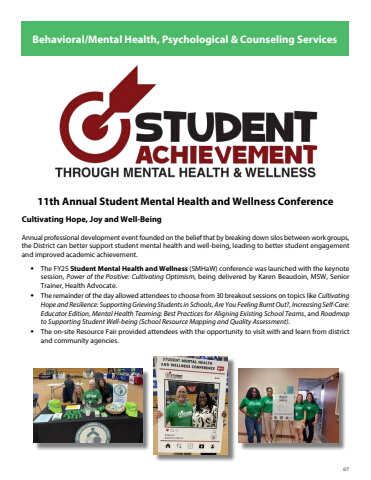 6711th Annual Student Mental Health and Wellness ConferenceCultivating Hope, Joy and Well-BeingAnnual professional development event founded on the belief that by breaking down silos between work groups, the District can better support student mental health and well-being, leading to better student engagement and improved academic achievement.%u008a The FY25 Student Mental Health and Wellness (SMHaW) conference was launched with the keynote session, Power of the Positive: Cultivating Optimism, being delivered by Karen Beaudoin, MSW, Senior Trainer, Health Advocate.%u008a The remainder of the day allowed attendees to choose from 30 breakout sessions on topics like Cultivating Hope and Resilience: Supporting Grieving Students in Schools, Are You Feeling Burnt Out?, Increasing Self-Care: Educator Edition, Mental Health Teaming: Best Practices for Aligning Existing School Teams, and Roadmap to Supporting Student Well-being (School Resource Mapping and Quality Assessment).%u008a The on-site Resource Fair provided attendees with the opportunity to visit with and learn from district and community agencies.Behavioral/Mental Health, Psychological & Counseling Services