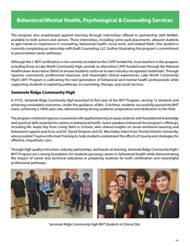 69The program also emphasized applied learning through internships offered in partnership with BeWell, available to both juniors and seniors. These internships, including some paid placements, allowed students to gain hands-on experience in counseling, behavioral health, social work, and related fields. One student is currently completing an internship with Kaafi Counseling, LLC, further illustrating the program%u2019s commitment to personalized career pathways.Although the C-BHT certification is not currently included on the CAPE funded list, most teachers in the program, including those at Lake Worth Community High, provide an alternative CAPE-funded exam through the National Healthcareer Association (NHA) to ensure students continue to earn industry-recognized credentials. Through rigorous coursework, professional exposure, and meaningful clinical experiences, Lake Worth Community High%u2019s BHT Program is cultivating the next generation of behavioral and mental health professionals while supporting students in exploring pathways in counseling, therapy, and social services.Behavioral/Mental Health, Psychological & Counseling ServicesIn FY25, Seminole Ridge Community High launched its first year of the BHT Program, serving 12 students and achieving remarkable outcomes. Under the guidance of Mrs. Critchlow, students successfully passed the BHT exam, achieving a 100% pass rate, demonstrating strong academic preparation and dedication to the field.The program combined rigorous coursework with applied learning to equip students with foundational knowledge and practical skills essential for careers in behavioral health. Guest speakers enhanced the program%u2019s offerings, including Ms. Kayla Irby from Living Skills in Schools, who shared insights on social emotional learning and behavioral support practices, and Dr. David Simpson and Dr. Marcheley Adam from Florida Atlantic University, who provided Trauma-Informed Training to help students understand the effects of trauma and strategies for effective, empathetic care.Through high-quality instruction, industry partnerships, and hands-on learning, Seminole Ridge Community High%u2019s BHT Program set a strong foundation for students pursuing careers in behavioral health while demonstrating the impact of career and technical education in preparing students for both certification and meaningful professional pathways.Seminole Ridge Community HighSeminole Ridge Community High BHT Students in Clinical Site.