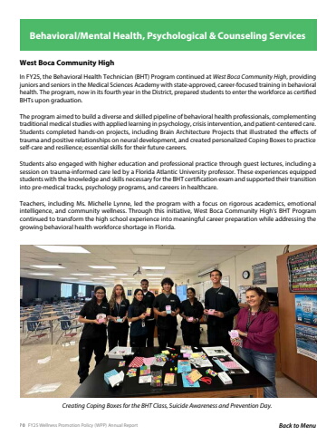 70 FY25 Wellness Promotion Policy (WPP) Annual Report Back to MenuBehavioral/Mental Health, Psychological & Counseling ServicesWest Boca Community HighIn FY25, the Behavioral Health Technician (BHT) Program continued at West Boca Community High, providing juniors and seniors in the Medical Sciences Academy with state-approved, career-focused training in behavioral health. The program, now in its fourth year in the District, prepared students to enter the workforce as certified BHTs upon graduation.The program aimed to build a diverse and skilled pipeline of behavioral health professionals, complementing traditional medical studies with applied learning in psychology, crisis intervention, and patient-centered care. Students completed hands-on projects, including Brain Architecture Projects that illustrated the effects of trauma and positive relationships on neural development, and created personalized Coping Boxes to practice self-care and resilience; essential skills for their future careers.Students also engaged with higher education and professional practice through guest lectures, including a session on trauma-informed care led by a Florida Atlantic University professor. These experiences equipped students with the knowledge and skills necessary for the BHT certification exam and supported their transition into pre-medical tracks, psychology programs, and careers in healthcare.Teachers, including Ms. Michelle Lynne, led the program with a focus on rigorous academics, emotional intelligence, and community wellness. Through this initiative, West Boca Community High%u2019s BHT Program continued to transform the high school experience into meaningful career preparation while addressing the growing behavioral health workforce shortage in Florida.Creating Coping Boxes for the BHT Class, Suicide Awareness and Prevention Day.