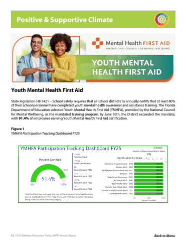 72 FY25 Wellness Promotion Policy (WPP) Annual Report Back to MenuYouth Mental Health First AidState legislation HB 1421 %u2013 School Safety requires that all school districts to annually certify that at least 80% of their school personnel have completed youth mental health awareness and assistance training. The Florida Department of Education selected Youth Mental Health First Aid (YMHFA), provided by the National Council for Mental Wellbeing, as the mandated training program. By June 30th, the District exceeded the mandate, with 91.4% of employees earning Youth Mental Health First Aid certification.Figure 1YMHFA Participation Tracking Dashboard FY25 Positive & Supportive Climate