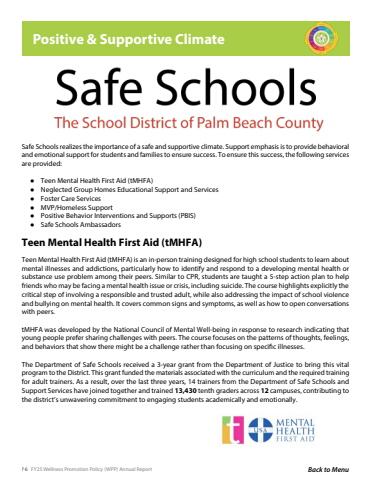 76 FY25 Wellness Promotion Policy (WPP) Annual Report Back to MenuTeen Mental Health First Aid (tMHFA)Teen Mental Health First Aid (tMHFA) is an in-person training designed for high school students to learn about mental illnesses and addictions, particularly how to identify and respond to a developing mental health or substance use problem among their peers. Similar to CPR, students are taught a 5-step action plan to help friends who may be facing a mental health issue or crisis, including suicide. The course highlights explicitly the critical step of involving a responsible and trusted adult, while also addressing the impact of school violence and bullying on mental health. It covers common signs and symptoms, as well as how to open conversations with peers.tMHFA was developed by the National Council of Mental Well-being in response to research indicating that young people prefer sharing challenges with peers. The course focuses on the patterns of thoughts, feelings, and behaviors that show there might be a challenge rather than focusing on specific illnesses.The Department of Safe Schools received a 3-year grant from the Department of Justice to bring this vital program to the District. This grant funded the materials associated with the curriculum and the required training for adult trainers. As a result, over the last three years, 14 trainers from the Department of Safe Schools and Support Services have joined together and trained 13,430 tenth graders across 12 campuses, contributing to the district%u2019s unwavering commitment to engaging students academically and emotionally. Safe Schools realizes the importance of a safe and supportive climate. Support emphasis is to provide behavioral and emotional support for students and families to ensure success. To ensure this success, the following services are provided:%u25cf Teen Mental Health First Aid (tMHFA)%u25cf Neglected Group Homes Educational Support and Services%u25cf Foster Care Services%u25cf MVP/Homeless Support%u25cf Positive Behavior Interventions and Supports (PBIS)%u25cf Safe Schools AmbassadorsPositive & Supportive Climate