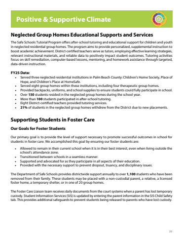 77Supporting Students in Foster CareOur Goals for Foster StudentsOur primary goal is to provide the level of support necessary to promote successful outcomes in school for students in foster care. We accomplished this goal by ensuring our foster students are:%u2022 Allowed to remain in their current school when it is in their best interest, even when living outside the school%u2019s attendance zone.%u2022 Transitioned between schools in a seamless manner.%u2022 Supported and advocated for as they participate in all aspects of their education.%u2022 Provided with the necessary support to prevent dropout, truancy, and disciplinary issues.The Department of Safe Schools provides districtwide support annually to over 1,100 students who have been removed from their family. These students may be placed with a non-custodial parent, a relative, a licensed foster home, a temporary shelter, or in one of 20 group homes. The Foster Care Liaison team receives daily documents from the court systems when a parent has lost temporary custody. Student Information Services (SIS) is updated by entering the parent information in the SIS Child Safety tab. This provides additional safeguards to prevent students being released to parents who have lost custody.Neglected Group Homes Educational Supports and ServicesThe Safe Schools Tutorial Program offers after-school tutoring and educational support for children and youth in neglected residential group homes. The program aims to provide personalized, supplemental instruction to boost academic achievement. District-certified teachers serve as tutors, employing effective learning strategies, relevant instructional materials, and reliable data to positively impact student outcomes. Tutoring activities focus on skill remediation, computer-based lessons, mentoring, and homework assistance through targeted, data-driven instruction.FY25 Data:%u2022 Served three neglected residential institutions in Palm Beach County: Children%u2019s Home Society, Place of Hope, and Children%u2019s Place at HomeSafe.%u2022 Served eight group homes within these institutions, including four therapeutic group homes.%u2022 Provided backpacks, uniforms, and school supplies to ensure students could fully participate in school.%u2022 Over 150 students resided in the neglected group homes during the school year.%u2022 More than 100 students participated in after-school tutoring.%u2022 Eight District-certified teachers provided tutoring services.%u2022 21% of students in the neglected group homes withdrew from the District due to new placements.Positive & Supportive Climate